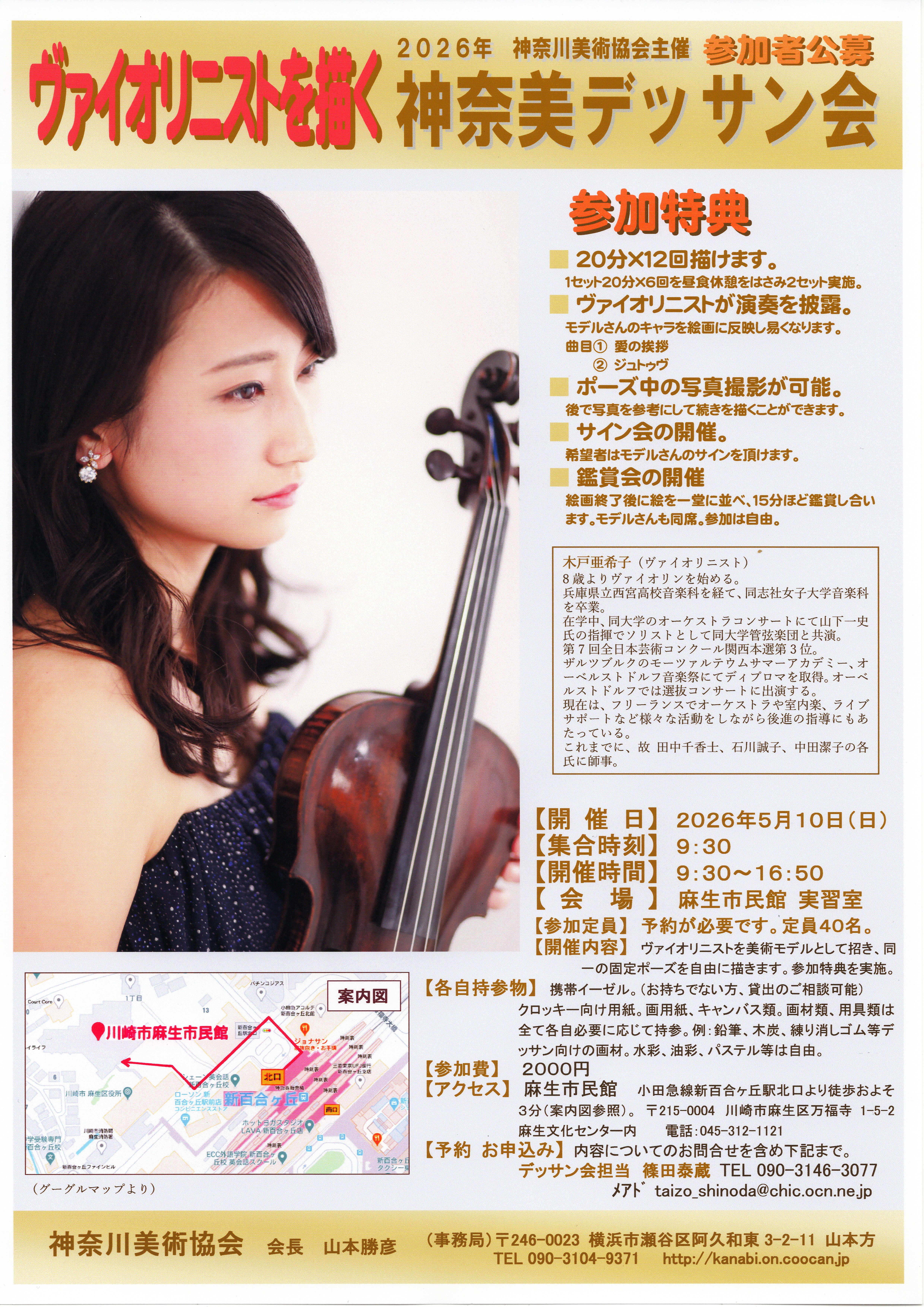 - 「ヴァイオリニスト歌手を描く」神奈美デッサン会 5月10日(日)午前9時30分~午後4時50分 川崎市麻生市民館 2階 実習室 ・・・モデル:女性着衣モデル 一般参加自由(要予約)